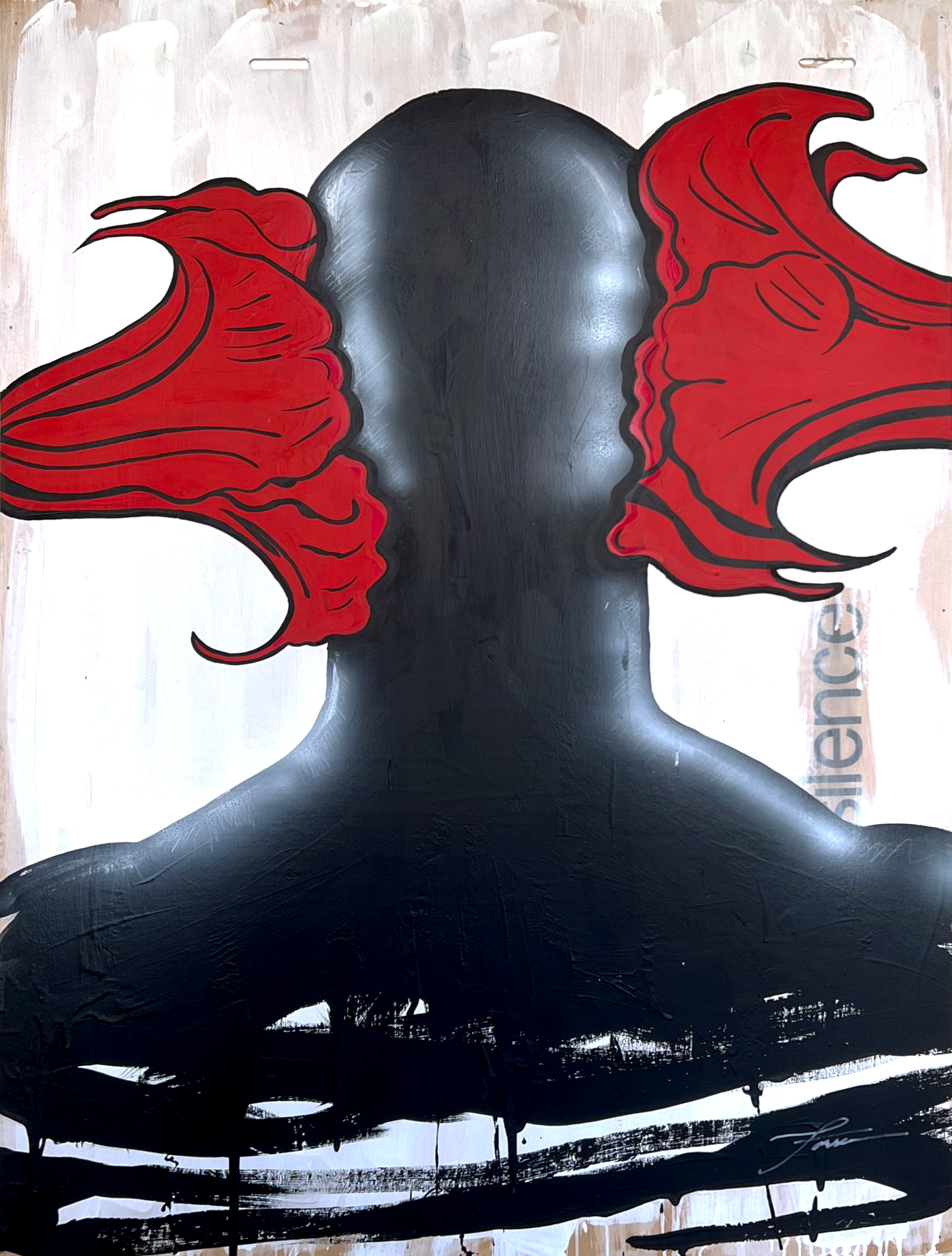 Acrylics and coloured pencils on reclaimed plywood | 158cm x 79cm (“62” x “31.2”)